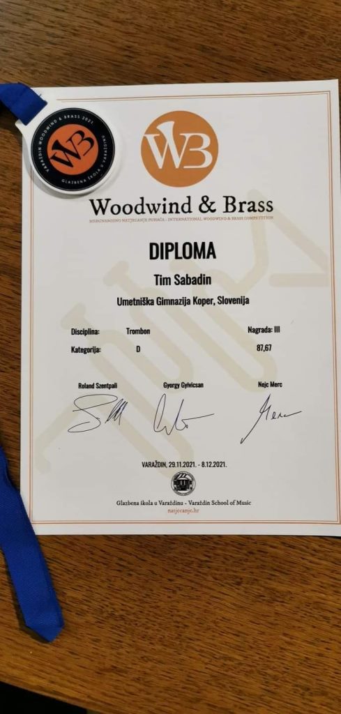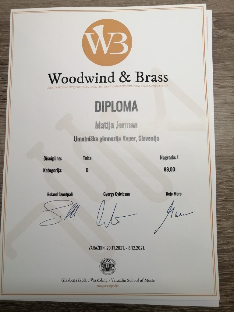Na mednarodnem tekmovanju trobilcev v Varaždinu (Hrvaška), na katerem so sodelovali mladi glasbeniki iz desetih držav, so naši dijaki dosegli zavidljive rezultate. Med slednimi se je s 1. nagrado in 99 točkami (od 100 točk) najvišje zavihtel tubist Matija Jerman.
