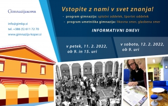 Vabimo vas, da nas obiščete na virtualnem informativnem dnevu v petek, 11. 2. 2022, ob 9. in ob 15. uri, in v soboto, 12. 2. 2022, ob 9. uri.