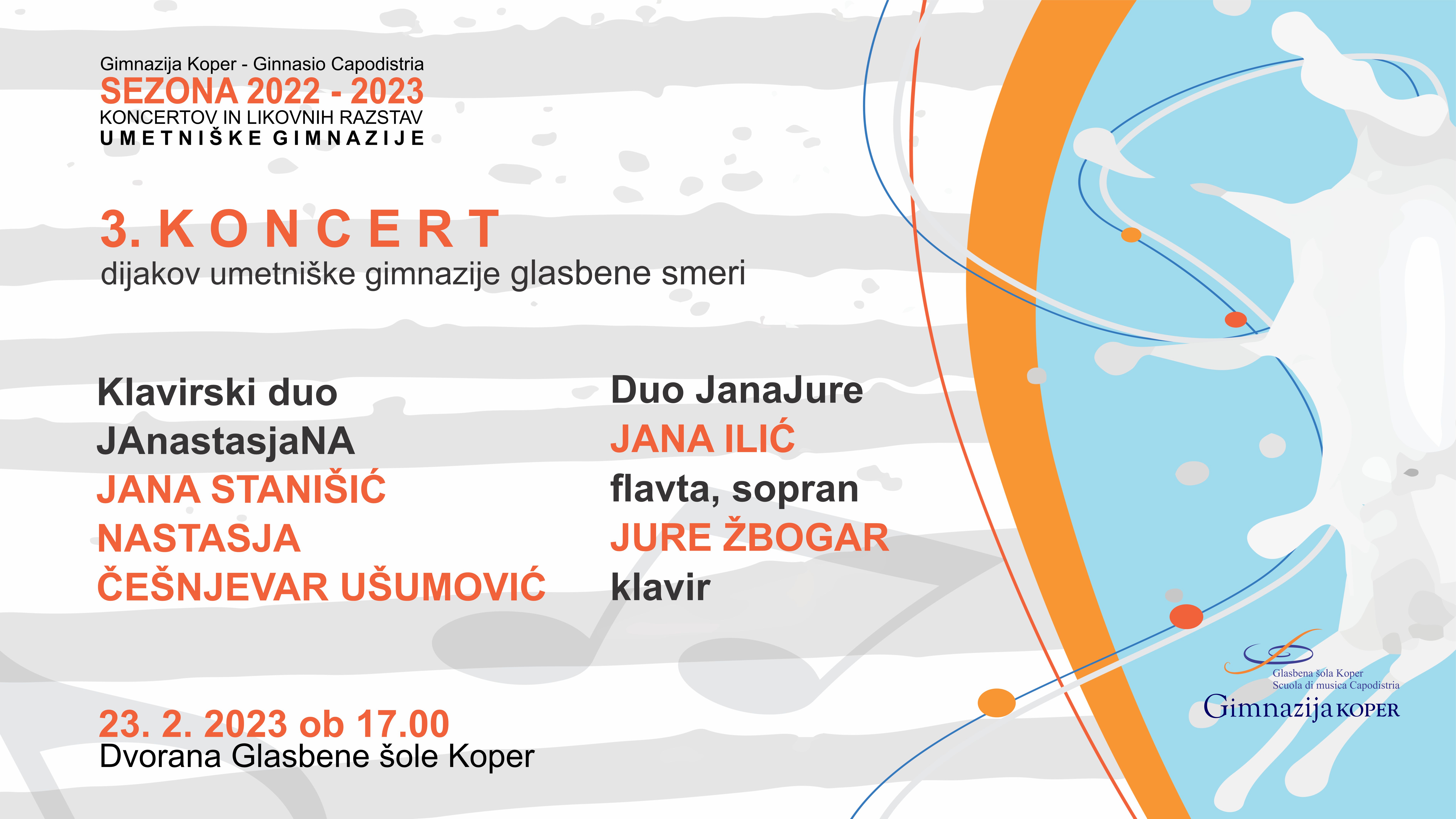 Na tretjem koncertu v sezoni koncertov in likovnih razstav dijakov programa Umetniška gimnazija na Gimnaziji Koper se nam bo v četrtek, 23. 2. 2023, ob 17. uri, v Koncertni dvorani Glasbene šole Koper, predstavil Klavirski duo JAnastasjaNA. Jana Stanišić in Nastasja Češnjevar Ušumović igrata v duu pod mentorstvom Nene Rion.