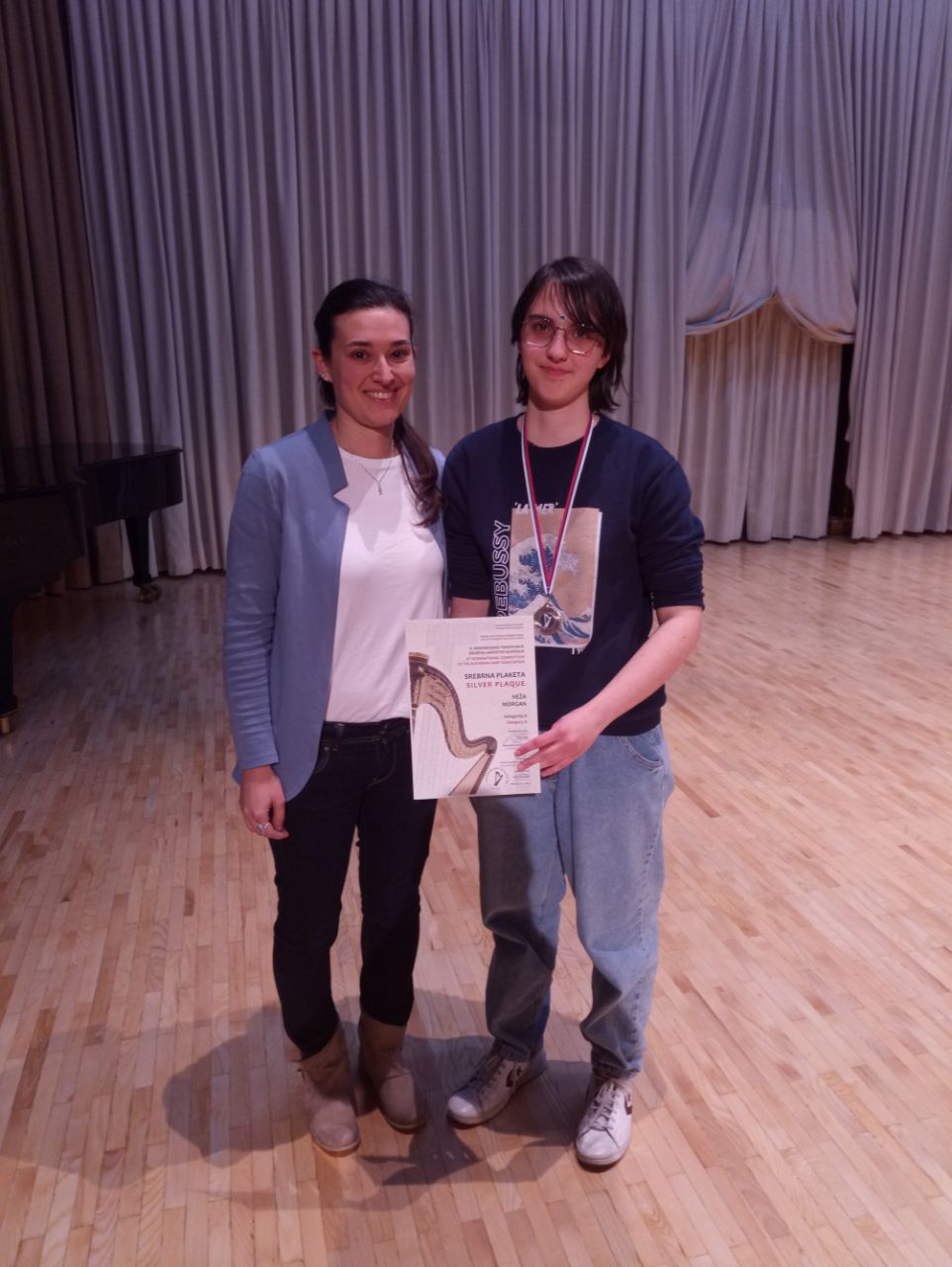 Naša mlada harfistka Neža Morgan se je uspešno predstavila na 6. mednarodnem tekmovanju Društva harfistov Slovenije, ki je potekalo na Glasbeni šoli Frana Koruna Koželjskega v Velenju. Nastopila je v kategoriji D in prejela srebrno plaketo. Čestitamo!