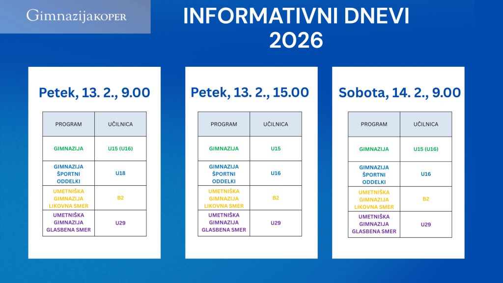 Gimnazija Koper je v slovenski Istri ena najstarejših šol z bogato tradicijo, ki pripravlja dijake na nadaljnji študij. Dijake želimo opremiti z uporabnim znanjem in jim omogočiti, da svoje sposobnosti in interese uresničijo v svojem življenju. Programa Gimnazija v splošnih in športnih oddelkih ter Umetniška gimnazija sta namenjena vsem, ki si želijo pridobiti ustrezno izobrazbo in nadaljevati šolanje na želeni fakulteti ali akademiji.