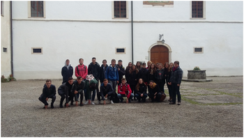 (Na fotografiji: dijaki in učiteljici zgodovine na dvorišču brežiškega gradu.)
