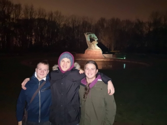 Med povratkom domov so se Matija, Rok in Matic takole veselili svojega odličnega nastopa. V ozadju je spomenik Fredericu Chopinu v Varšavi.