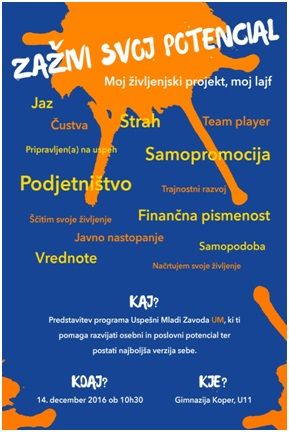 Predstavitev programa Uspešni mladi skupaj s sodelavci Zavoda UM bo v sredo, 14. 12. 2016, ob 10.30 v U11. »Predstavili bomo program, ki ti bo pomagal razvijati tvoj osebni in poslovni potencial ... postal(a) boš najboljša verzija sebe. Več na povezavi https://www.facebook.com/uspesni.mladi/«
