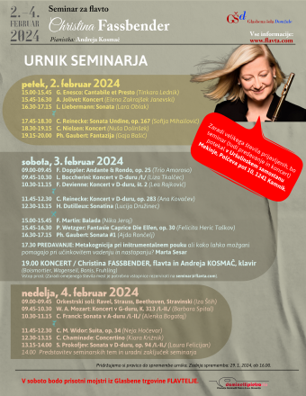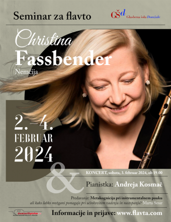 Od petka do nedelje, 2.–4. februarja 2024, je v Uršulinskem samostanu Mekinje pri Kamniku potekal seminar za flavto nemške flavtistke Christine Fassbender iz Berlina. Pasivno se ga je udeležila naša dijakinja 1. d Kristin Primožič iz razreda mag. Alenke Zupan.